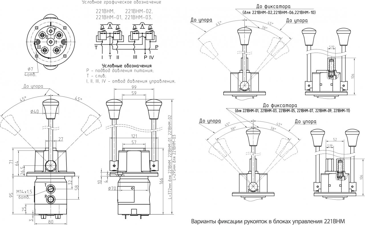 Блок типа 221ВНМ унифицирован по присоединительным размерам с блоком 101BH, но имеет меньшее в 1,5 раза сопротивление рабочих отводов в слив за счет увеличения сечения отводящих каналов и проходных сечений в золотнике, чтопозволяет расширить области применения блока управления.