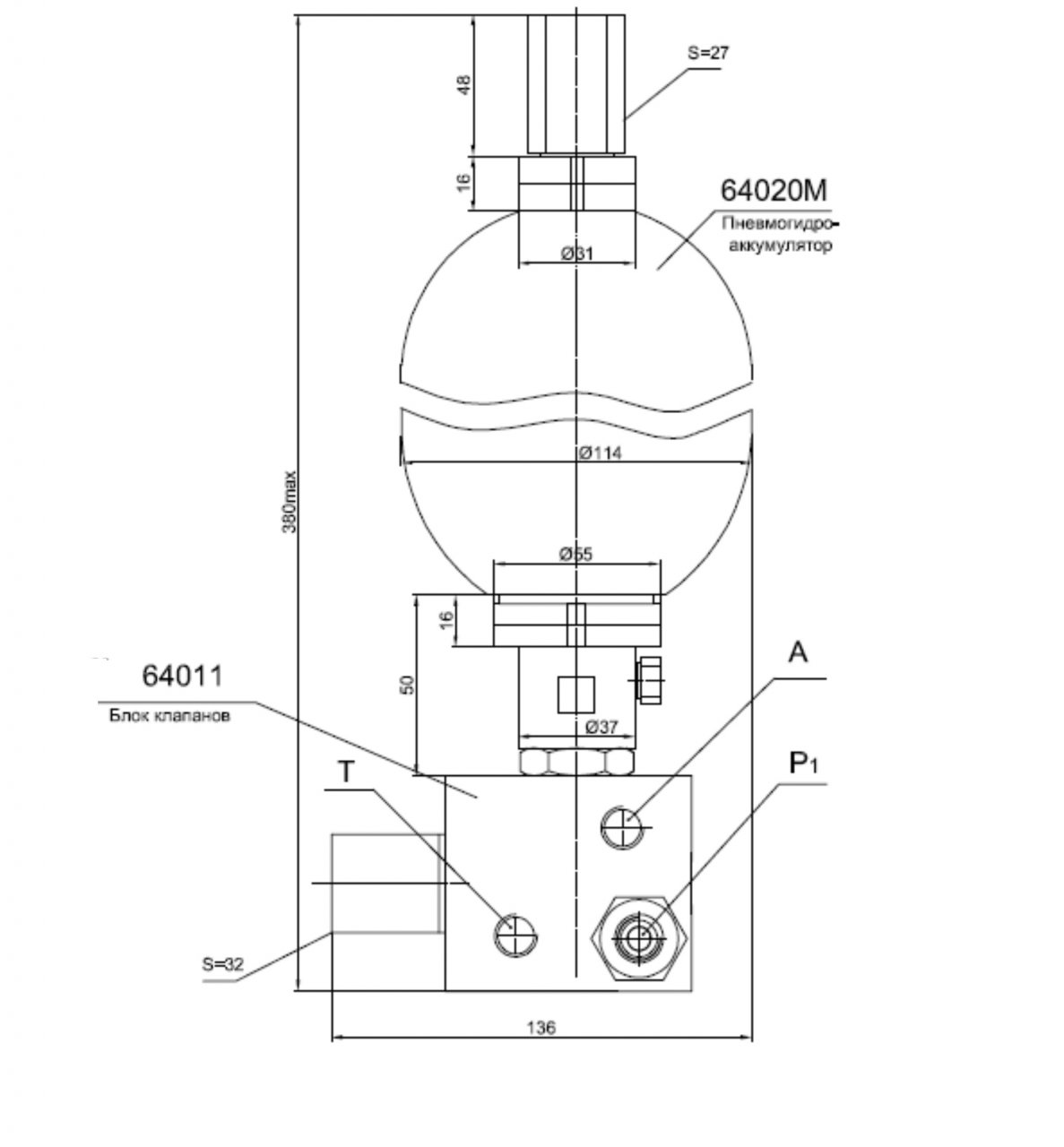 Пневмогидроаккумулятор 64020 М может поставляться как самостоятельное изделие, так с блоком клапанов 64011.